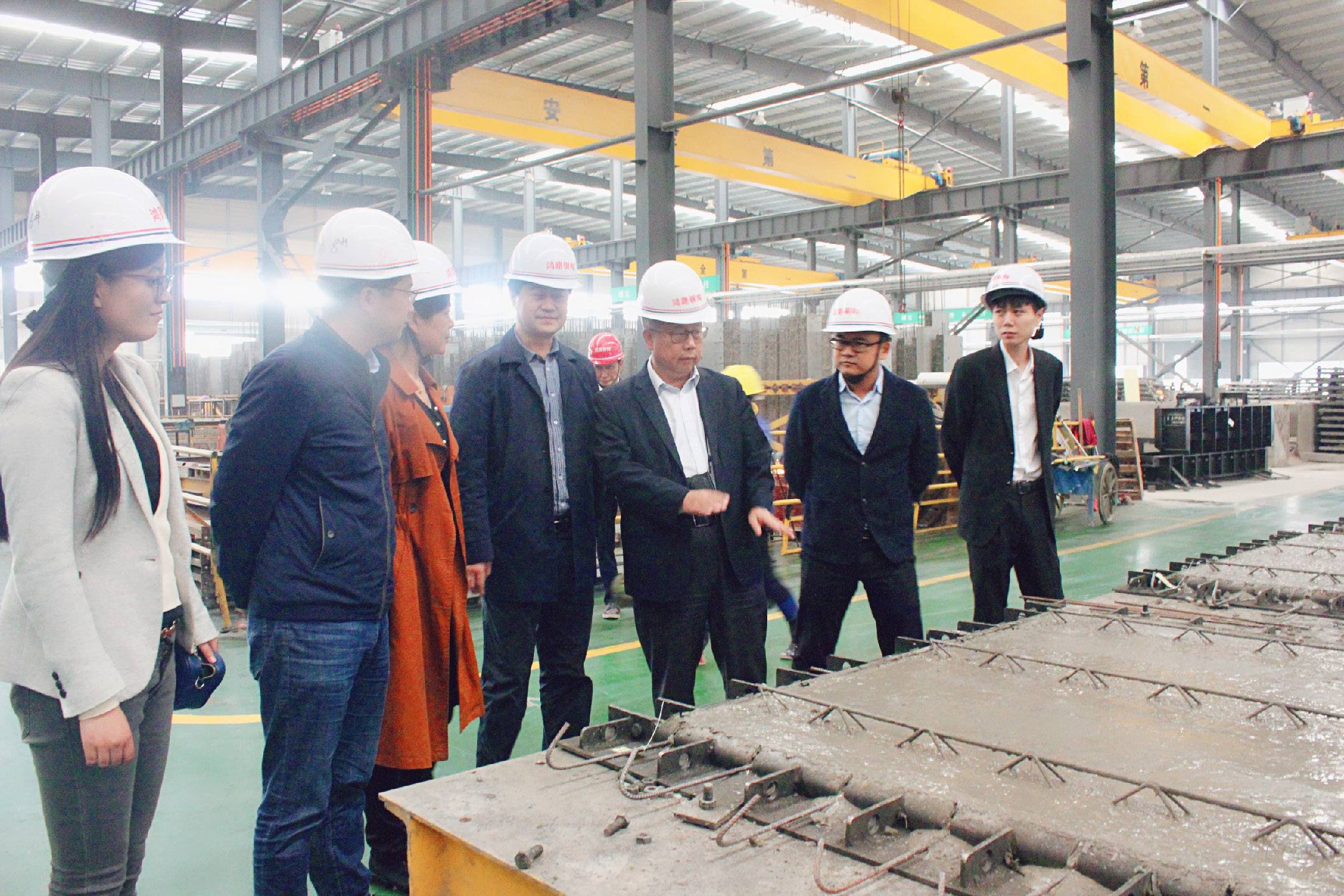 在王總、孫總的陪同下,觀看了鴻路宣傳片并實地來到位于公司旁邊的安徽最大的裝配式建筑鳳棲苑項目現(xiàn)場,聽取了裝配式建筑情況介紹。其后又陸續(xù)到公司的JCOE制管加工車間、PC構(gòu)件的生產(chǎn)車間、智能化生產(chǎn)車間等生產(chǎn)加工車間各環(huán)節(jié)參觀。