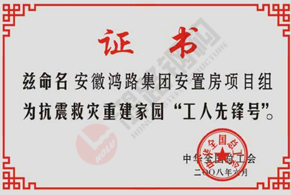 證書茲命名鴻路集團(tuán)安置項(xiàng)目組為抗震救災(zāi)重建家園“工人先鋒號(hào)”