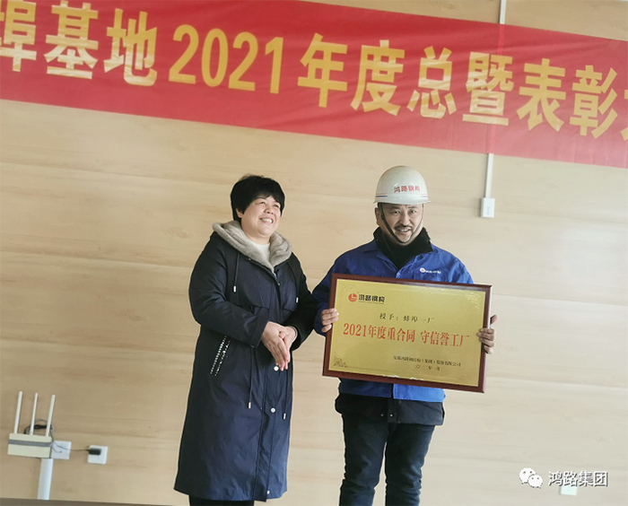 辭舊歲,歡欣鼓舞慶佳績(jī);迎新春,豪情滿懷譜新章。2022年1月8日上午,集團(tuán)公司黨委書記商曉紅帶領(lǐng)黨委班子成員前往公司蚌埠基地和渦陽(yáng)基地召開(kāi)2021年度總結(jié)表彰大會(huì)??偨Y(jié)盤點(diǎn)全年工作,表彰在過(guò)去一年里為鴻路鋼構(gòu)發(fā)展作出突出貢獻(xiàn)的先進(jìn)工廠,引導(dǎo)和激勵(lì)廣大員工立足崗位,敬業(yè)奉獻(xiàn),為完成2022年工作目標(biāo)匯聚力量。